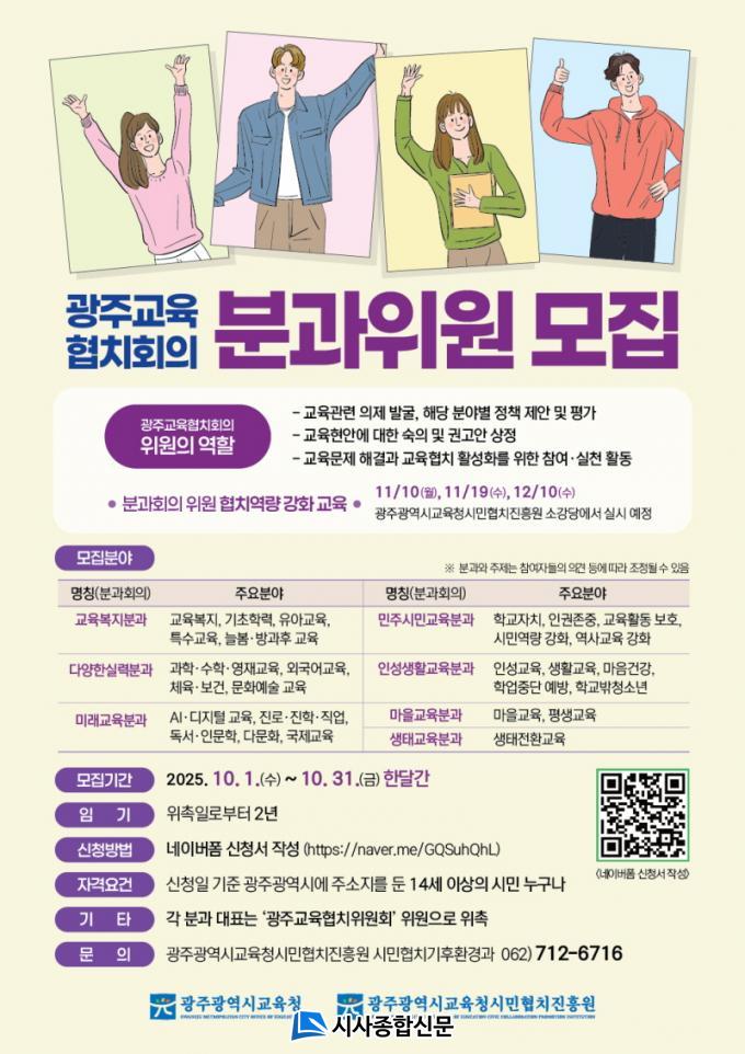 ¡®±¤ÁÖ±³À°ÇùġȸÀÇ¡¯´Â Áö¿ª»çȸ¿Í ÇÔ²²ÇÏ´Â ½Ã¹ÎÇùÄ¡ Ȱ¼ºÈ¸¦ À§ÇØ Áö³ 2023³â 1±â¸¦ ¸ðÁýÇß´Ù. ½Ã¹ÎÇùÄ¡ÁøÈï¿øÀº 1±â À§¿øÀÇ ÀӱⰡ ¿À´Â 10¿ù 31ÀÏ Á¾·áµÊ¿¡ µû¶ó 2±â À§¿øÀ» ¸ðÁýÇÑ´Ù.