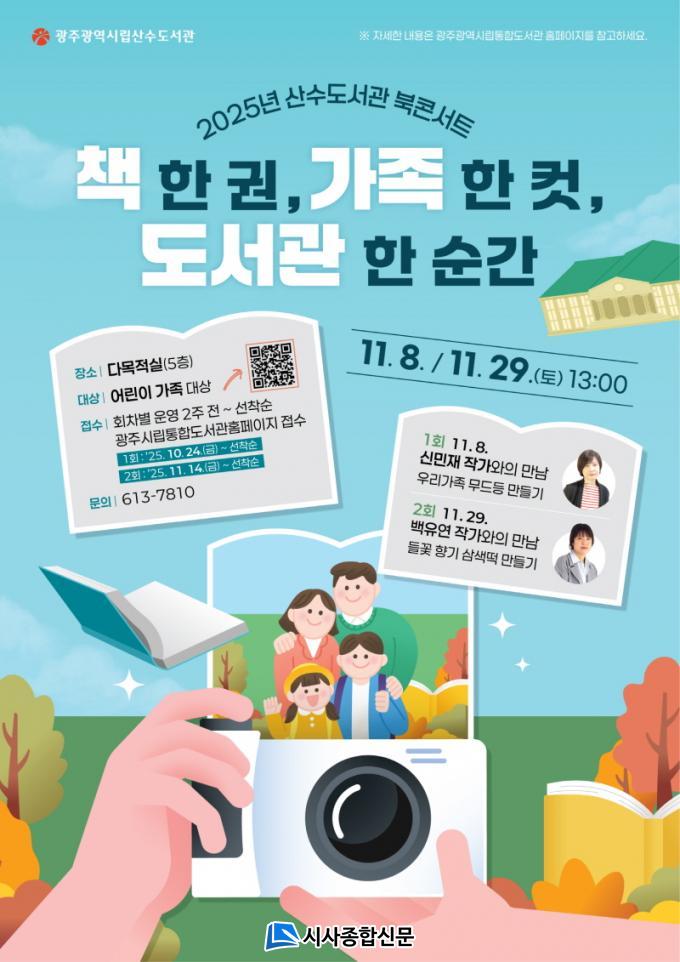 »ê¼öµµ¼°üÀ» ÀÌ¿ëÇÏ´Â ¾î¸°ÀÌ °¡Á·Àº ´©±¸³ª Âü¿©ÇÒ ¼ö ÀÖÀ¸¸ç, Âü°¡ ½ÅûÀº 10¿ù 24ÀϺÎÅÍ ±¤Áֽø³µµ¼°ü ´©¸®Áý(citylib.gwangju.go.kr)À» ÅëÇØ ¼±Âø¼ø(1ȸÂ÷-8ÀÏ 15°¡Á·, 2ȸÂ÷-29ÀÏ 12°¡Á·) Á¢¼öÇÑ´Ù. ÀÚ¼¼ÇÑ »çÇ×Àº ´©¸®ÁýÀ» Âü°íÇϰųª »ê¼öµµ¼°ü(613-7810)À¸·Î ¹®ÀÇÇÏ¸é µÈ´Ù.