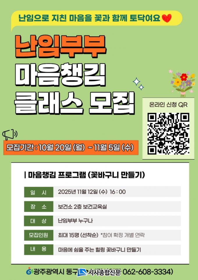 [½Ã»çÁ¾ÇսŹ® = ¿À½ÂÅà ±âÀÚ] ±¤ÁÖ µ¿±¸(ûÀå ÀÓÅÃ)´Â ³ÀÓÀ¸·Î ¾î·Á¿òÀ» °Þ°í ÀÖ´Â ºÎºÎµéÀÇ ½É¸®Àû ¾ÈÁ¤À» µ½±â À§ÇØ ¿À´Â 11¿ù 12ÀÏ ¡®³ÀӺκΠ¸¶À½Ã¬±è Ŭ·¡½º¡¯¸¦ ¿î¿µÇÑ´Ù°í ¹àÇû´Ù.