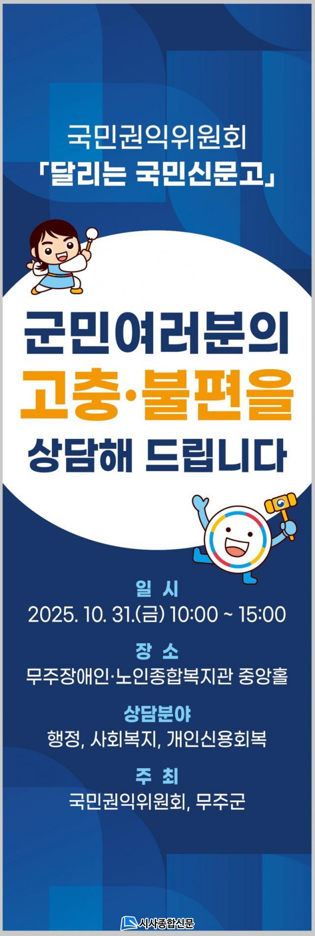 ´çÀÏ ¿ÀÀü 10½ÃºÎÅÍ ¿ÀÈÄ 3½Ã±îÁö ±¹¹Î±ÇÀÍÀ§¿øÈ¸ Á¶»ç°ü°ú Çѱ¹»çȸº¹ÁöÇùÀÇȸ, ½Å¿ëȸº¹À§¿øÈ¸ µî Çù¾÷ ±â°üÀÇ Àü¹® »ó´ã ÀηÂÀÌ ¹«ÁÖÀ¾ ¼ÒÀç ¹«ÁÖ»ó»ó¹Ýµð½£ ´Ù¸ñÀû½Ç¿¡¼ ¹«ÁÖ±º¹Îµé°ú ¸¸³¯ ¿¹Á¤ÀÌ´Ù.