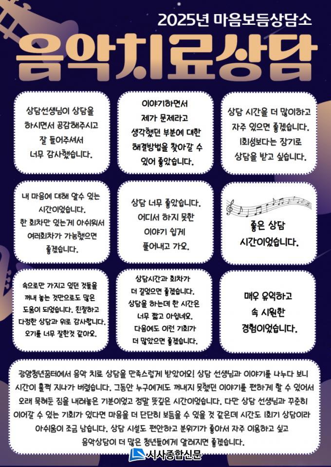 À½¾ÇÄ¡·á»ó´ã¿¡ Âü¿©ÇÑ ¶Ç ´Ù¸¥ û³âÀº ¡°À½¾ÇÀ» ÅëÇØ °¨Á¤À» ÀÚ¿¬½º·´°Ô Ç¥ÇöÇÒ ¼ö ÀÖ¾ú°í, »ó´ã»ç¿ÍÀÇ ´ëȸ¦ ÅëÇØ ¸¶À½ÀÌ ÇÑ°á °¡º¿öÁ³´Ù¡±¸ç ¡°½º½º·Î¸¦ À§·ÎÇÒ ¼ö ÀÖ´Â µû¶æÇÑ ½Ã°£À̾ú´Ù¡±°í ÀüÇß´Ù.
