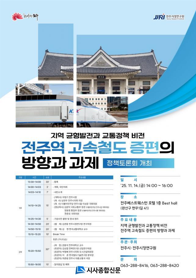 ÀüÁÖ½Ã¿Í ÀüÁÖ½ÃÁ¤¿¬±¸¿øÀº ¿À´Â 11¿ù 14ÀÏ ¿ÀÈÄ 2½Ã, º£½ºÆ®¿þ½ºÅÏÇ÷¯½º ÀüÁÖÈ£ÅÚ 1Ãþ º£½ºÆ®È¦(¿Ï»ê±¸ Çö¹«1±æ 41)¿¡¼ ¡®Áö¿ª ±ÕÇü¹ßÀü°ú ±³ÅëÁ¤Ã¥ ºñÀü-ÀüÁÖ¿ª °í¼Óöµµ ÁõÆí ¹æÇâ°ú °úÁ¦¡¯¸¦ ÁÖÁ¦·Î Á¤Ã¥Åä·Ðȸ¸¦ °³ÃÖÇÑ´Ù.