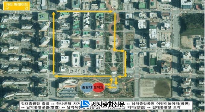 ÃàÁ¦ÀÇ ´ëÇ¥ÇÁ·Î±×·¥ÀÎ °Å¸® ÆÛ·¹À̵å´Â 15ÀÏ ¿ÀÈÄ 2½ÃºÎÅÍ 5½Ã±îÁö ÁøÇàµÇ¸ç, ±è´ëÁß±¤Àå ¡æ ÇϳªÀºÇà »ç°Å¸® ¡æ ±¹¹ÎÀºÇà »ç°Å¸® ¡æ ³²¾ÇÁß¾Ó°ø¿ø ¾î¸°À̳îÀÌÅÍ ¹æ¸é ¡æ ³²¾ÇÁß¾Ó°ø¿ø ¡æ ³²¾Ç¿Áõ³Ã¸é ¡æ ±¸ 10,000 LAB Ä¿ÇÇ ¡æ ±è´ëÁß±¤Àå ±¸°£Àº ÆÛ·¹ÀÌµå ½Ã°£ Àü¸é Â÷·® ÅëÁ¦°¡ ÀÌ·ç¾îÁø´Ù.