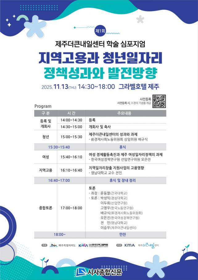 À̹ø ½ÉÆ÷Áö¾öÀº Á¦ÁÖÆ¯º°ÀÚÄ¡µµ¿Í Çѱ¹Áö¿ª°í¿ëÇÐȸ°¡ °øµ¿ ÁÖÃÖÇϰí, Á¦ÁÖ´õÅ«³»Àϼ¾ÅͰ¡ ÁÖ°üÇÏ´Â Çà»ç·Î, ¡®Áö¿ª°í¿ë°ú û³â ÀÏÀÚ¸® Á¤Ã¥¼º°ú¿Í ¹ßÀü¹æÇ⡯À» ÁÖÁ¦·Î ¿¸°´Ù. Àü±¹ÀÇ Áö¿ª°í¿ëÁ¤Ã¥ Àü¹®°¡¿Í ½Ç¹«ÀÚµéÀÌ ÇÑÀÚ¸®¿¡ ¸ð¿© ´Ù¾çÇÑ Á¤Ã¥ »ç·Ê¸¦ °øÀ¯Çϰí, ÇâÈÄ Áö¿ª ÀÏÀÚ¸® Á¤Ã¥ÀÇ ¹ßÀü ¹æÇâÀ» ³íÀÇÇÒ ¿¹Á¤ÀÌ´Ù.