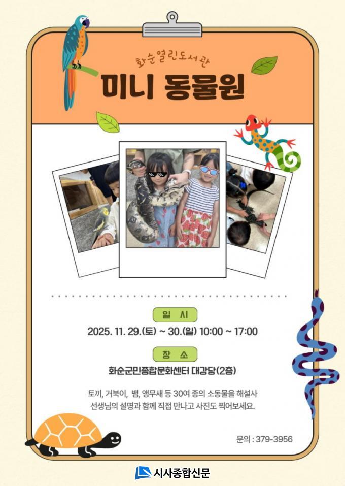 ¡°¹Ì´Ï µ¿¹°¿ø¡±Àº ¿ì¸® Áö¿ª¿¡¼ ½±°Ô ¸¸³ª±â Èûµç Æ÷À¯·ù, ÆÄÃæ·ù, Á¶·ù µî 30¿© Á¾ÀÇ ¼Òµ¿¹°À» ÇÑÀÚ¸®¿¡¼ ¸¸³¯ ¼ö Àִ üÇèÇü Àü½Ã Çà»ç´Ù. ÇØ¼³»çÀÇ µ¿¹° ¼³¸í, »çÁø ÃÔ¿µ µî ´Ù¾çÇÑ ÇÁ·Î±×·¥ÀÌ ¸¶·ÃµÇ¾î ÀÖ¾î ¾î¸°À̻Ӹ¸ ¾Æ´Ï¶ó, °¡Á· ´ÜÀ§ °ü¶÷°´µé¿¡°Ôµµ »ý»ýÇÑ ±³À° üÇèÀÇ ±âȸ¸¦ Á¦°øÇÒ ¿¹Á¤ÀÌ´Ù.