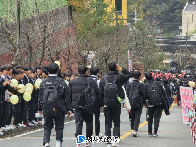 1¡¤2Çгâ Çлýµé°ú ±³Á÷¿ø µî 400¿© ¸íÀº ±³³» ´ëµ¿ÀÎÀÇ »ó~Çб³ ÁøÀÔ·Î »ï°Å¸®¿¡¼ Çϱ³ÇÏ´Â 3Çгâ ÇлýµéÀ» ¸Â¾Æ ¹Ú¼ö°¥Ã¤¸¦ º¸³»°í ¡°¼ö´É ´ë¹Ú! ÆÄÀÌÆÃ!¡±À» ¿ÜÄ¡¸ç ¿·ÄÇÑ ÀÀ¿øÀ» º¸³Â´Ù.