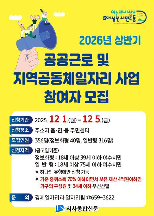 2026³â »ó¹Ý±â °ø°øÀÏÀÚ¸® »ç¾÷Àº 2¿ù 23ÀϺÎÅÍ 6¿ù 26ÀϱîÁö ¿î¿µµÇ¸ç ¼±¹ßÀÚ´Â Á¤º¸È Áö¿ø, °ø°ø¼ºñ½º Áö¿ø, ȯ°æÁ¤È µî ºÐ¾ß¿¡¼ ±Ù¹«ÇÏ°Ô µÈ´Ù.