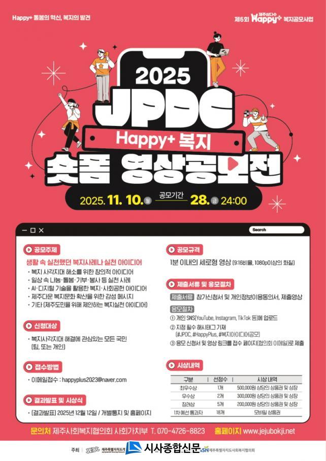 Á¦ÁÖÆ¯º°ÀÚÄ¡µµ°³¹ß°ø»ç(»çÀå ¹é°æÈÆ)´Â Á¦ÁÖµµ»çȸº¹ÁöÇùÀÇȸ(ȸÀå °í½ÂÈ), Á¦ÁÖ»çȸº¹Áö°øµ¿¸ð±Ýȸ(ȸÀå °Áö¾ð)¿Í ÇÔ²² ¿À´Â 11¿ù 28ÀϱîÁö ¡®2025³â JPDC Happy+º¹Áö ¼ôÆû¿µ»ó °ø¸ðÀü¡¯À» °³ÃÖÇÑ´Ù°í ¹àÇû´Ù.