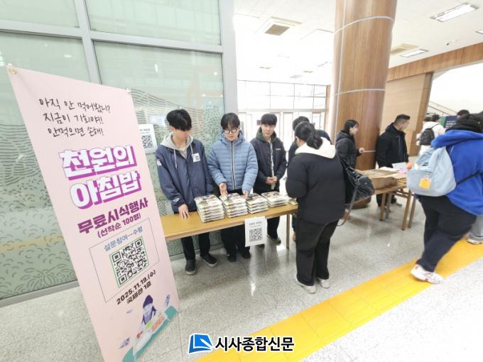 [½Ã»çÁ¾ÇսŹ® = ¿À½ÂÅà ±âÀÚ] Á¶¼±´ëÇб³(ÃÑÀå ±èÃἺ) Çлýº¹ÁöÆÀÀÌ ÃÑÇлýȸ¿Í ÇÔ²² ÇлýµéÀÇ °Ç°ÇÑ ¾ÆÄ§ ½Ä½À°ü µ¶·Á¿Í »ç¾÷ È«º¸¸¦ À§ÇØ 11¿ù 19ÀÏ(¼ö) ±¹Á¦°ü 1Ãþ¿¡¼ ¡®Ãµ¿øÀÇ ¾ÆÄ§¹ä¡¯ ¹«·á ½Ã½Ä À̺¥Æ®¸¦ ÁøÇàÇß´Ù.