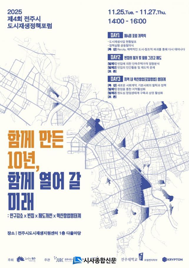 ÀüÁֽô ¿À´Â 25ÀϺÎÅÍ 27ÀϱîÁö 3Àϰ£ ÀüÁֽõµ½ÃÀç»ýÁö¿ø¼¾ÅÍ¿¡¼ µµ½ÃÀç»ý¿¡ °ü½ÉÀÌ Å« ½Ã¹Î°ú Àü¹®°¡, ½Ç¹«ÀÚ µîÀÌ ÇÔ²²ÇÏ´Â ¡®2025 Á¦4ȸ ÀüÁֽà µµ½ÃÀç»ýÁ¤Ã¥Æ÷·³¡¯À» °³ÃÖÇÑ´Ù°í 20ÀÏ ¹àÇû´Ù.