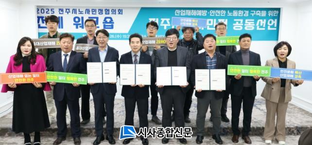 ¿öÅ©¼óÀÇ Ã¹ ¼ø¼´Â ¡®»ê¾÷ÀçÇØ ¾ø´Â ÀüÁÖ ½ÇÇö¡¯À» ¸ñÇ¥·Î ³»°Ç ³ë»ç¹ÎÁ¤ °øµ¿¼±¾ðÀ¸·Î Âü¼®ÀÚµéÀº ¡â¾ÈÀüº¸°Ç ±³À° Âü¿© ¡â¹ý·É Áؼö ¡âÁö¿ª»çȸ Âü¿© È®´ë ¡âÁ¤Ã¥ Áö¿ø °È µî °¢ ÁÖüÀÇ Ã¥¹«¸¦ ÇÔ²² ¼±¾ðÇϸç, »ê¾÷ÀçÇØ ¿¹¹æÀ» ÀüÁÖ½ÃÀÇ ÇÙ½É °¡Ä¡·Î »ï¾Æ 2026³â ¾ÈÀüÇÑ ³ëµ¿È¯°æ Á¶¼ºÀ» ¹Ýµå½Ã ´Þ¼ºÇϰڴٴ °øµ¿ ÀÇÁö¸¦ ¹àÇû´Ù.