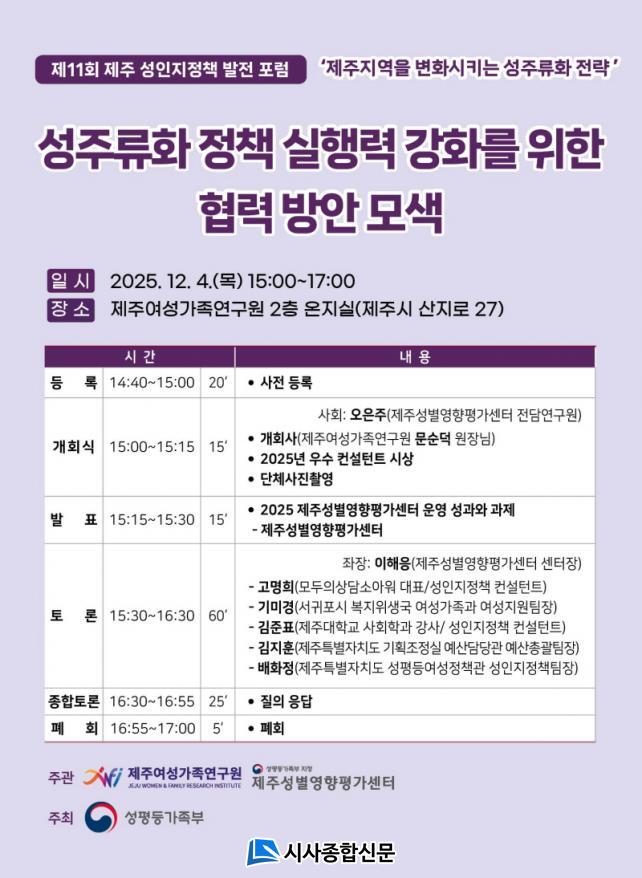 [½Ã»çÁ¾ÇսŹ® = °í¼º¹Î ±âÀÚ] Á¦ÁÖ¿©¼º°¡Á·¿¬±¸¿ø, ¿À´Â 12¿ù 4ÀÏ(¸ñ) ¿ÀÈÄ 3½Ã, Á¦ÁÖ¿©¼º°¡Á·¿¬±¸¿ø(»êÁö·Î 27) 2Ãþ ¿ÂÁö½Ç¿¡¼ ¡®¼ºÁÖ·ùÈ Á¤Ã¥ ½ÇÇà·Â °È¸¦ À§ÇÑ Çù·Â ¹æ¾È ¸ð»ö¡¯À» ÁÖÁ¦·Î Á¦11ȸ Á¦ÁÖ ¼ºÀÎÁöÁ¤Ã¥ ¹ßÀü Æ÷·³ÀÌ °³ÃֵȴÙ.