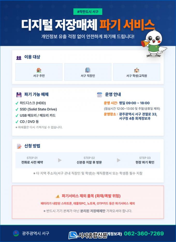 [½Ã»çÁ¾ÇսŹ® = ¿À½ÂÅà ±âÀÚ] ±¤ÁÖ±¤¿ª½Ã ¼±¸(±¸Ã»Àå ±èÀ̰)°¡ Áö¿ª ÁÖ¹ÎÀÇ °³ÀÎÁ¤º¸ º¸È£¿¡ ³ª¼±´Ù. ¼±¸´Â 12¿ù1ÀϺÎÅÍ µðÁöÅÐ ÀúÀå¸Åü¿¡ ´ã±ä °³ÀÎÁ¤º¸ À¯Ãâ ¹æÁö¸¦ À§ÇÑ ¡®µðÁöÅÐ ÀúÀå¸Åü ÆÄ±â ¼ºñ½º¡¯¸¦ ¹«·á·Î Á¦°øÇÑ´Ù°í ¹àÇû´Ù.
