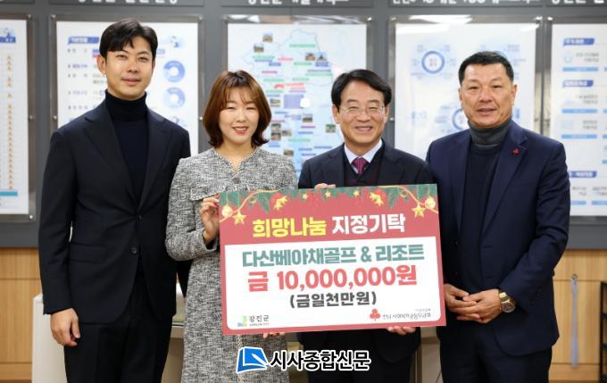 [½Ã»çÁ¾ÇսŹ® = ¿À½ÂÅà ±âÀÚ] ±èÀ¯¸² ´Ù»êº£¾ÆÃ¤ °ñÇÁ¾Ø¸®Á¶Æ®ÀÇ ÃѰý»çÀå°ú À庸¼º ´ëÇ¥, ±èÈï±æ »çÀåÀÌ ¿¬¸»À» ¸Â¾Æ Áö³ 11ÀÏ 'Èñ¸Á2026 ³ª´®Ä·ÆäÀÎ ÀÌ¿ôµ½ ±â' ¼º±Ý 1,000¸¸ ¿øÀ» °Áø±º¿¡ ±âŹÇß´Ù. À̵éÀº Áö³ 2019³âºÎÅÍ ¿ÃÇØ±îÁö 'Èñ¸Á³ª´®Ä·ÆäÀÎ'À» ÅëÇØ ¸Å³â 1,000¸¸ ¿øÀÇ ÀÌ¿ôµ½±â ¼º±Ý, 2023³â üÀ° ²Þ³ª¹« À°¼ºÀ» À§ÇØ °Áø±º üÀ°È¸¿¡ 1,000¸¸ ¿øÀ» ±âºÎÇÏ´Â µî ²ÙÁØÈ÷ »çȸ°øÇå Ȱµ¿À» ÇØ¿À°í ÀÖ´Ù.