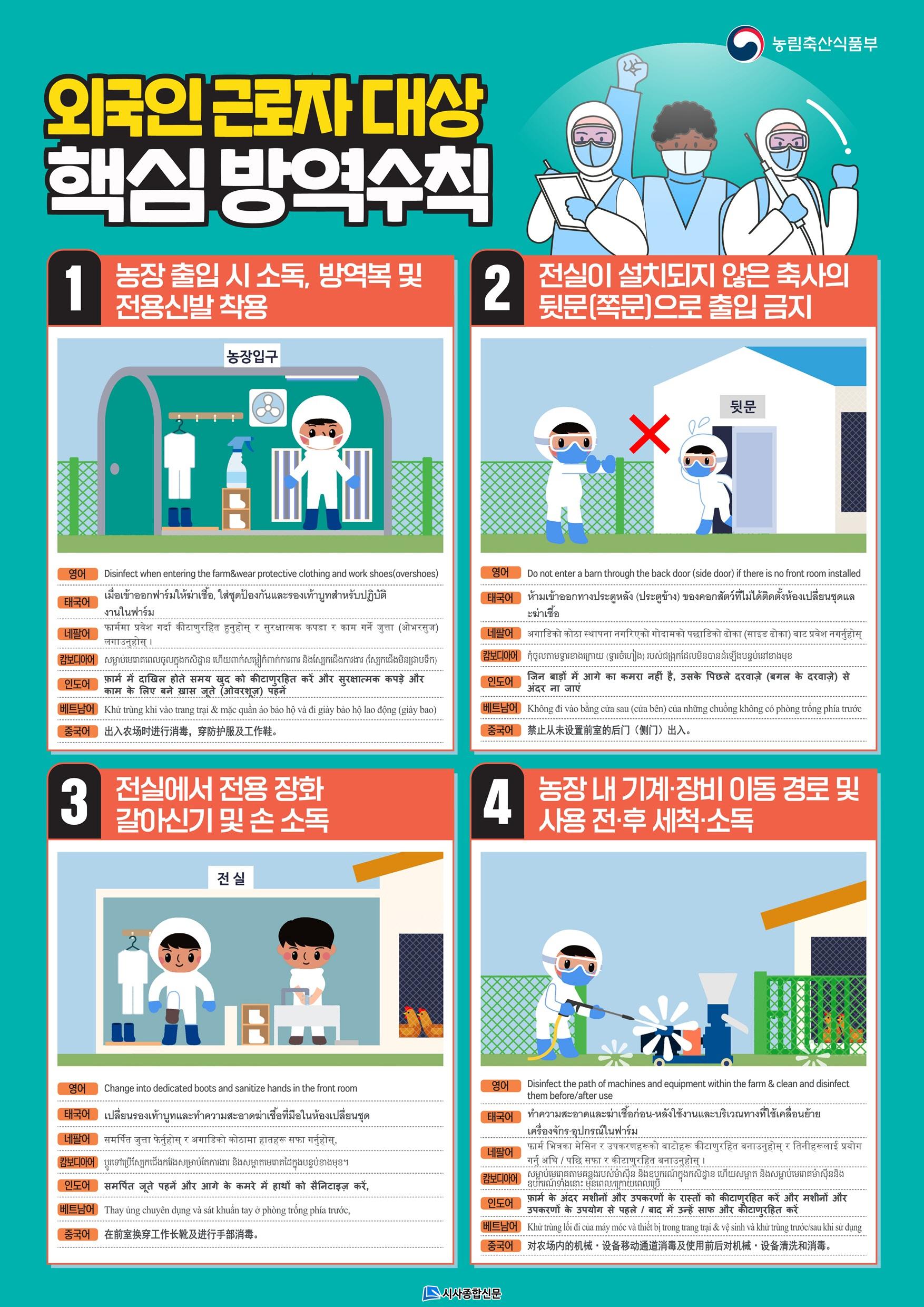 ÀÌ¿¡ µû¶ó µµ´Â ¿Ü±¹ÀÎ ±Ù·ÎÀÚ¸¦ ÅëÇÑ ¹ÙÀÌ·¯½º À¯ÀÔ °¡´É¼ºÀ» Â÷´ÜÇϱâ À§ÇØ ÀÔ±¹ ÈÄ 5Àϰ£ ³óÀ塤Ãà»ç ÃâÀÔÀ» Á¦ÇÑÇϰí, ºÒ¹ý Ãà»ê¹° ¹ÝÀÔ ±ÝÁö ¼¾à¼ ¡±¸¿Í ¹æ¿ª ±³À°À» °ÈÇÒ ¹æÄ§ÀÌ´Ù. ³óÀå ÃâÀÔ ½Ã¿¡´Â ȯº¹°ú Àü¿ë ÀåÈ Âø¿ë, ½Å¹ß¡¤ÀǺ¹¡¤¼ÒÁöǰ ¼Òµ¶ µî ±âº» ¹æ¿ª ¼öÄ¢À» öÀúÈ÷ ÀÌÇàÇϵµ·Ï ÁöµµÇÑ´Ù.