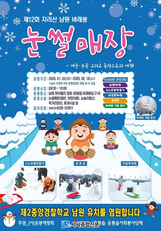 ÇÑÆí, ¿îºÀ ¹Ù·¡ºÀ ÀÏ¿ø¿¡¼´Â 2026³â 1¿ù 3ÀϺÎÅÍ 2¿ù 18ÀϱîÁö ´«²ÉÃàÁ¦°¡ °³ÃֵȴÙ. ÃàÁ¦ ±â°£ µ¿¾È ¸Ô°Å¸® ÀåÅÍ, ½ä¸ÅÀå, ´«³îÀÌ µ¿»ê, ÈްԽü³ µîÀÌ ¿î¿µµÅ °Ü¿ï üÇèÄÜÅÙÃ÷¸¦ ÇÑÃþ °ÈÇϸç, ¿Â ¼¼»óÀÌ ÇÏ¾á ¼³°æÀ¸·Î µÚµ¤ÀΠdz°æ ¼Ó¿¡¼ ¡®ÃäÁö¸¸ ±×·¡¼ ´õ Ưº°ÇÑ ³²¿øÀÇ °Ü¿ï¡¯À» Á÷Á¢ ü°¨ÇÒ ¼ö ÀÖ´Ù.