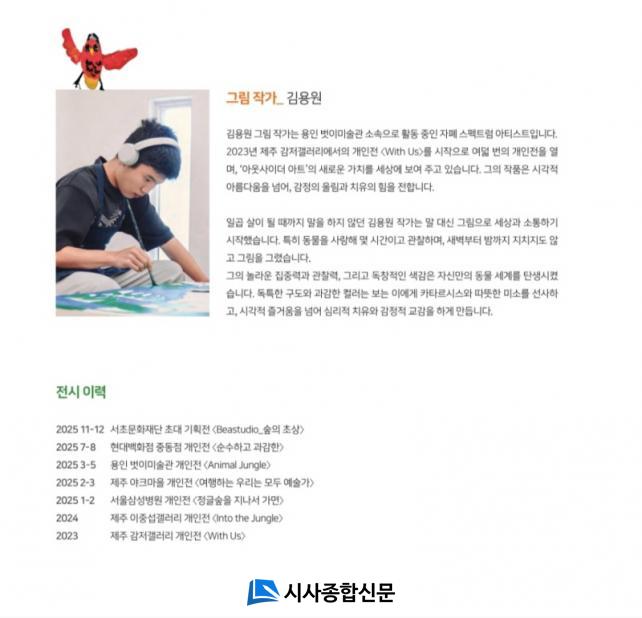 ±×¸²À» ±×¸° ±è¿ë¿ø ÇлýÀº ¿ëÀÎ ¹þÀ̹̼ú°ü ¼Ò¼Ó ¾ÆÆ®ºê·ò(Art Brut) ÀÛ°¡·Î¼ °³ÀÎÀü 8ȸ¿Í 50¿© ȸÀÇ ´ÜüÀü¿¡ Âü¿©ÇÏ´Â µî Ȱ¹ßÇÑ Ã¢ÀÛ È°µ¿À» ÀÌ¾î ¿ÔÀ¸¸ç Áö³ÇØ 1¿ù ¼¿ï»ï¼ºº´¿ø¿¡¼ ¿¸° °³ÀÎÀü¿¡¼ ÃâÆÇ»ç °ü°èÀÚÀÇ Á¦¾ÈÀ¸·Î À̹ø Ãâ°£ÀÌ ÃßÁøµÅ ±×ÀÇ ¿¹¼úÀû ¼ºÀåÀ» ´õ ¸¹Àº À̵é°ú °øÀ¯ÇÏ´Â °è±â°¡ µÇ¾ú´Ù.