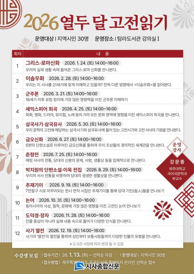 ¡®¿µÎ ´Þ °íÀü Àб⡮´Â ¸Å¿ù ÇÑ ÆíÀÇ °íÀüÀ» ÇÔ²² ÀÐ°í °¿¬À» ÅëÇØ ´Ù¾çÇÑ ÇØ¼®À» °øÀ¯ÇÏ´Â ÇÁ·Î±×·¥À¸·Î ¿ÃÇØ´Â ±×¸®½º ·Î¸¶½ÅÈ, ±ºÁÖ·Ð, »ï±¹»ç±â, ±Ý¿À½ÅÈ µî 12ÆíÀÇ µ¿¡¤¼¾ç °íÀüÀ» Ȱ¿ëÇÏ¿© °íÀü ¼Ó¿¡ ´ã±ä ÄÜÅÙÃ÷¸¦ ¸¸³ª º¼ ¿¹Á¤ÀÌ´Ù.