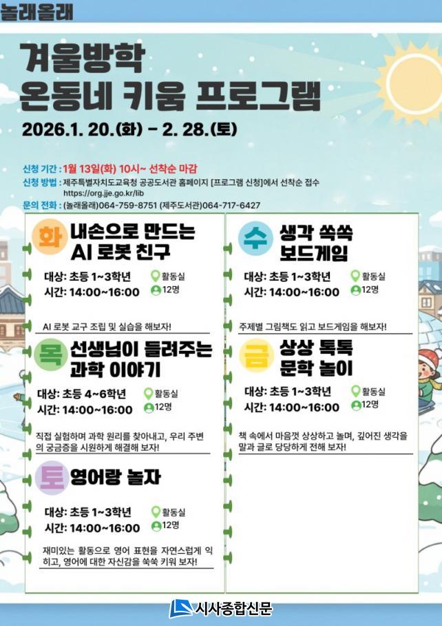 ¿î¿µ ÇÁ·Î±×·¥Àº ¸ÅÁÖ È¿äÀϺÎÅÍ Åä¿äÀÏ ¿ÀÈÄ 2½Ã¿¡ ¿äÀϺ°·Î Ư»ö ÀÖ°Ô ÁøÇàµÇ¸ç ¡âÀΰøÁö´É(AI) ·Îº¿ ÄÚµù(È) ¡âµ¶¼ º¸µå°ÔÀÓ(¼ö) ¡ââÀÇ À¶ÇÕ °úÇРȰµ¿(¸ñ) ¡âµ¶¼ ³í¼ú(±Ý) ¡â¿µ¾î ±×¸²Ã¥ ¼ö¾÷(Åä) µî ÃÑ 5°³ ºÐ¾ßÀÌ´Ù.