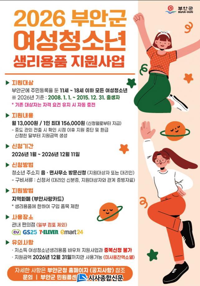 Áö¿ø´ë»óÀº ¼Òµæ¼öÁذú °ü°è¾øÀÌ ºÎ¾È±º¿¡ ÁÖ¼Ò¸¦ µÐ 11¼¼ºÎÅÍ 18¼¼±îÁöÀÇ ¿©¼ºÃ»¼Ò³âÀ¸·Î, 2026³â ±âÁØ 2008³â 1¿ù 1ÀÏ~2015³â 12¿ù 31ÀÏ »çÀÌ Ãâ»ýÀÚÀÌ´Ù. ´Ü, ´Ù¸¥ ¹ý·É¿¡ ±Ù°ÅÇØ »ý¸®¿ëǰÀ» Áö¿ø¹Þ´Â ´ë»óÀÚ´Â Áߺ¹À¸·Î ½ÅûÇÒ ¼ö ¾ø´Ù.