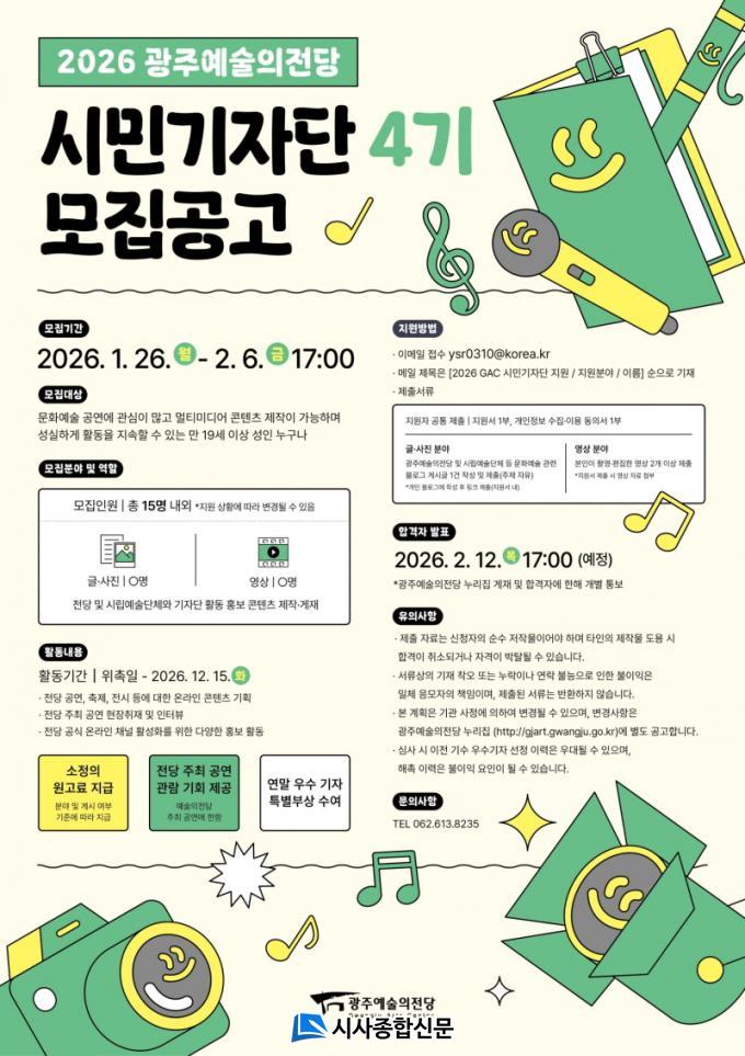 [½Ã»çÁ¾ÇսŹ® = ¿À½ÂÅà ±âÀÚ] ±¤ÁÖ±¤¿ª½Ã ¿¹¼úÀÇÀü´çÀº Àü´çÀÇ ´Ù¾çÇÑ °ø¿¬ Á¤º¸¿Í ¹®È ¼Ò½ÄÀ» Á÷Á¢ ÃëÀçÇÏ°í °ø½Ä ¿Â¶óÀΠä³ÎÀ» ÅëÇØ ¾Ë¸± ¡®2026 ±¤ÁÖ¿¹¼úÀÇÀü´ç ½Ã¹Î±âÀÚ´Ü 4±â¡¯¸¦ 26ÀϺÎÅÍ 2¿ù6ÀϱîÁö ¸ðÁýÇÑ´Ù.