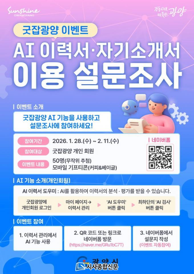 Âü¿©¸¦ Èñ¸ÁÇÏ´Â °³ÀÎȸ¿øÀº ¡®±ÂÀⱤ¾ç¡¯ ´©¸®Áý(https://job.gwangyang.go.kr)¿¡ Á¢¼ÓÇØ ¡ã¸¶ÀÌÆäÀÌÁö(À̷¼ °ü¸®)¿¡¼ À̷¼ µî·Ï ÈÄ ¡ãAI µµ¿ì¹ÌÀÇ AI °Ë»ç ±â´ÉÀ» ÀÌ¿ë ¡ã´©¸®Áý °øÁö»çÇס¤¹®ÀÇ ¸Þ´º¿¡¼ ¡ãÀ̺¥Æ® °Ô½ÃÆÇ¿¡ ¾È³»µÈ ¼³¹®Á¶»ç ¸µÅ© ¶Ç´Â QRÄڵ带 ÅëÇØ ¼³¹®¿¡ Âü¿©Çϸé ÀÚµ¿À¸·Î À̺¥Æ®¿¡ ÀÀ¸ðµÈ´Ù.