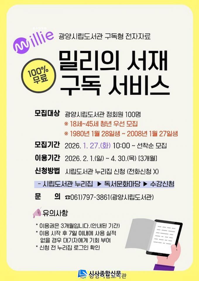 1ºÐ±â Âü¿©ÀÚ ¸ðÁýÀº 1¿ù 27ÀÏ È¿äÀÏ ¿ÀÀü 10½ÃºÎÅÍ ¼±Âø¼øÀ¸·Î ÁøÇàµÈ´Ù. ½ÅûÀº ±¤¾ç½Ã¸³µµ¼°ü ´©¸®ÁýÀÇ ¡®µ¶¼¡¤¹®È¸¶´ç¡¯ ³» ¼ö°½Åû ¸Þ´º¿¡¼ °¡´ÉÇϸç, ÀÚ¼¼ÇÑ »çÇ×Àº ±¤¾çÁß¾Óµµ¼°ü(¢Ï061-797-3861)À¸·Î ¹®ÀÇÇÏ¸é µÈ´Ù.