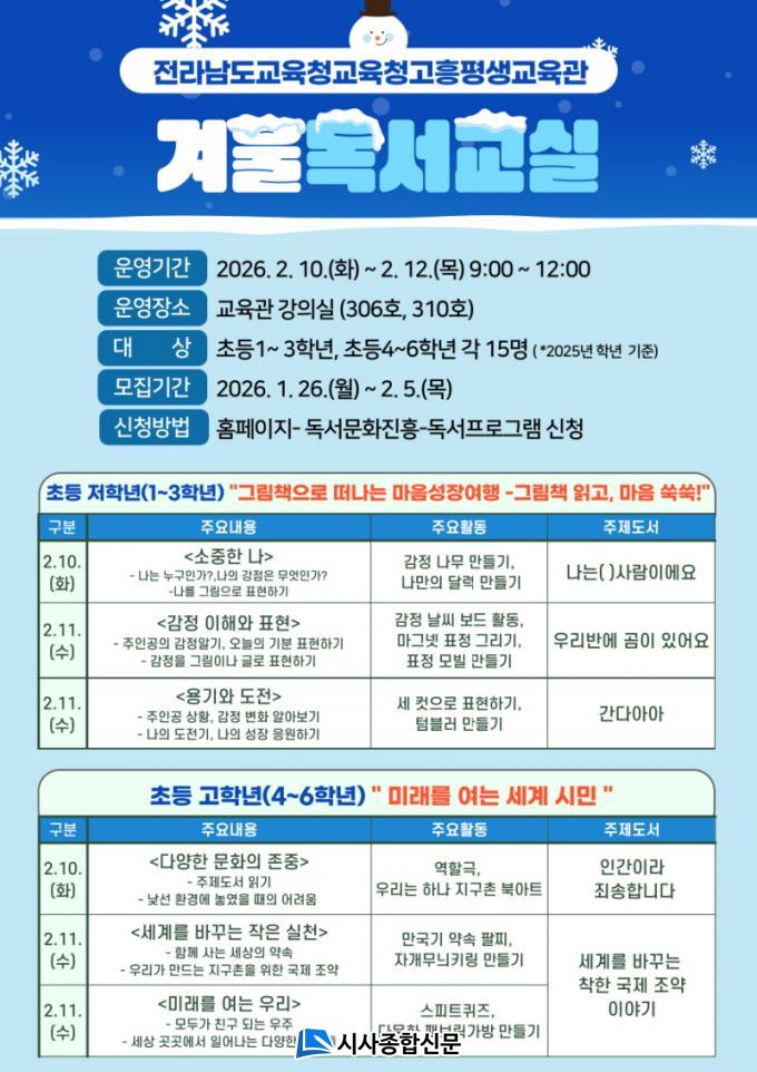 À̹ø °Ü¿ï µ¶¼±³½ÇÀº 2¿ù 10ÀÏ(È)ºÎÅÍ 2¿ù 12ÀÏ(¸ñ)±îÁö 3Àϰ£ ÃʵîÇлý 30¸íÀ» ´ë»óÀ¸·Î ¿î¿µÇϸç Ã¥ Àб⸦ ¹ÙÅÁÀ¸·Î »ý°¢À» ³ª´©´Â µ¶¼Ã¼Çè Ȱµ¿À¸·Î ±¸¼ºµÈ´Ù.