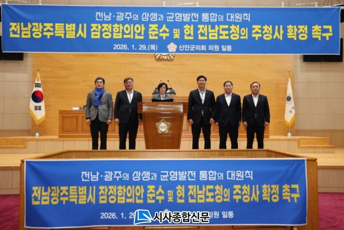 ½Å¾È±ºÀÇȸ´Â À̹ø °áÀǹ®À» ÅëÇØ ¡°Àü³²¡¤±¤ÁÖ ÇàÁ¤ÅëÇÕÀº ¼öµµ±Ç ÁýÁß°ú Áö¹æ¼Ò¸ê À§±â¿¡ ´ëÀÀÇϱâ À§ÇÑ Àü·«Àû ¼±Åá±À̶ó¸ç, ¡°ÅëÇÕ¿¡ ´ëÇÑ ½Å·Ú¸¦ Áö۱â À§Çؼ´Â Àü³²±¤ÁÖÆ¯º°½ÃÀÇ ÇàÁ¤ Áß½ÉÀ» Çö Àü¶ó³²µµÃ» ¼ÒÀçÁö¿¡ ¸íÈ®È÷ µÎ´Â °ÍÀÌ ÃÖ¼ÒÇÑÀÇ Ãâ¹ßÁ¡¡±À̶ó°í °Á¶Çß´Ù.