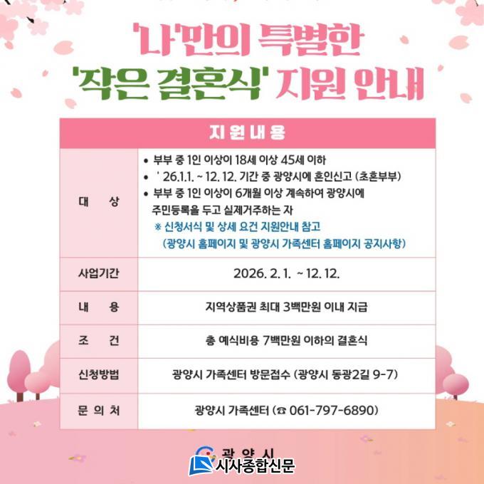 ±¤¾ç½Ã´Â À̹ø ÀÛÀº °áÈ¥½Ä Áö¿ø»ç¾÷À» ÅëÇØ °áÈ¥À» ÁغñÇÏ´Â ½ÅÈ¥ºÎºÎÀÇ Ãʱ⠰æÁ¦Àû ºÎ´ãÀ» ¿ÏÈÇϰí, °úµµÇÑ È¥·Ê ¹®È¿¡¼ ¹þ¾î³ ÇÕ¸®ÀûÀ̰í ÀÇ¹Ì ÀÖ´Â °áÈ¥¹®È°¡ Áö¿ª»çȸ¿¡ Á¤ÂøµÉ °ÍÀ¸·Î ±â´ëÇϰí ÀÖ´Ù.