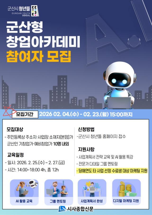 ±º»ê½Ã °ü°èÀÚ´Â ¡°À̹ø â¾÷¾ÆÄ«µ¥¹Ì°¡ Áö¿ª â¾÷ÀÚµéÀÇ ÀΰøÁö´É(AI) Ȱ¿ë ¿ª·®À» °ÈÇϰí, Â÷º°ÈµÈ »ç¾÷°èȹ ¼ö¸³À» ÅëÇØ ½ÇÁúÀûÀÎ ¼º°ú·Î À̾îÁö´Â °è±â°¡ µÇ±â¸¦ ¹Ù¶õ´Ù.¡±¶ó¸ç ¡°Á¤ºÎÁö¿ø»ç¾÷ ´ëÀÀ ¿ª·® °È¿Í ´õºÒ¾î Çõ½ÅÀûÀÎ »ç¾÷ ¾ÆÀ̵ð¾î ¹ß±¼À» ÅëÇØ ±º»ê½Ã â¾÷ »ýŰèÀÇ ÁúÀû ¼ºÀåÀ» À̲ø °ÍÀ¸·Î ±â´ëÇÑ´Ù.¡±¶ó°í ¹àÇû´Ù.