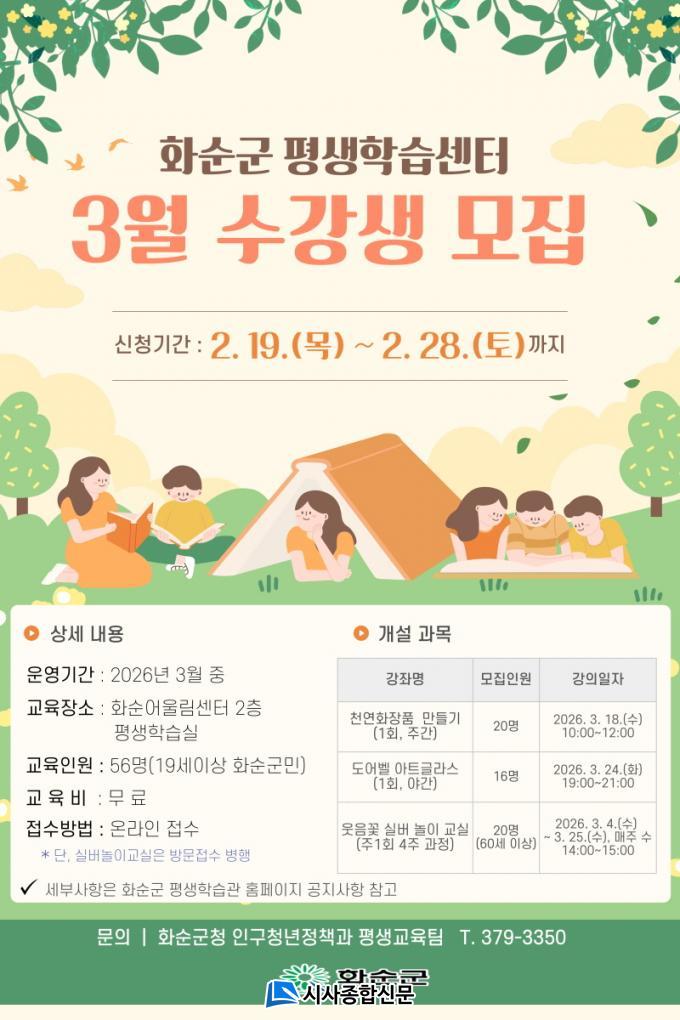 ¸ðÁýÀοøÀº 19¼¼ ÀÌ»ó ȼø±º¹Î ÃÑ 56¸íÀ̸ç, ÀÌ Áß ¡®¿ôÀ½²É ½Ç¹ö ³îÀÌ ±³½Ç¡¯Àº 60¼¼ ÀÌ»óÀÇ ÁÖ¹ÎÀ» ´ë»óÀ¸·Î ÇÑ´Ù. ¸ðµç ±³À° °úÁ¤Àº ¹«·á·Î ¿î¿µµÈ´Ù.