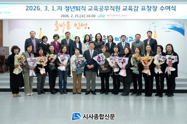 | Á¦ÁÖÆ¯º°ÀÚÄ¡µµ±³À°Ã», 3¿ù 1ÀÏÀÚ Á¤³âÅðÁ÷ ±³À°°ø¹«Á÷¿ø ±³À°°¨ ǥâ ¼ö¿©½Ä °³ÃÖ ¡°Á¦ÁÖ±³À° ¹ßÀüÀ» À§ÇÑ Çå½Å¿¡ °¨»çÀÇ ¸¶À½ ÀüÇÕ´Ï´Ù¡± |