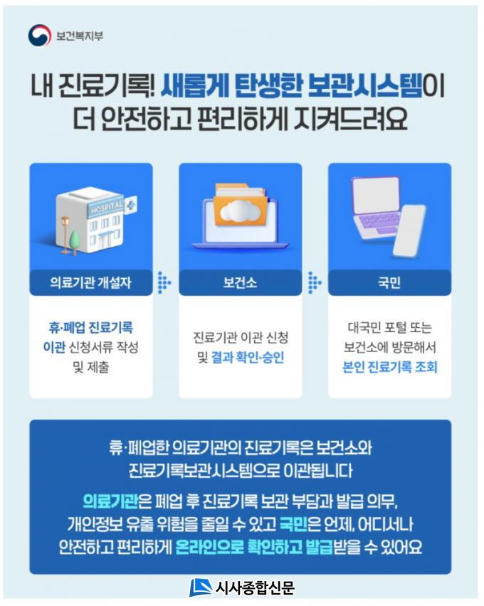 ÈÞ¡¤Æó¾÷ ÀÇ·á±â°ü Áø·á±â·Ïº¸°ü½Ã½ºÅÛÀº º´¡¤ÀÇ¿øÀÌ ¹®À» ´Ý¾Æµµ ȯÀÚÀÇ Áø·á±â·ÏÀ» ¾ÈÀüÇÏ°Ô º¸°üÇϰí, ÇÊ¿ä½Ã ¿Â¶óÀÎÀ¸·Î ¿¶÷Çϰųª »çº»À» ¹ß±Þ¹ÞÀ» ¼ö ÀÖµµ·Ï Áö¿øÇÏ´Â ¼ºñ½º´Ù. Áö³ÇØ 7¿ù 21ÀϺÎÅÍ º»°Ý ½ÃÇàµÆ´Ù.