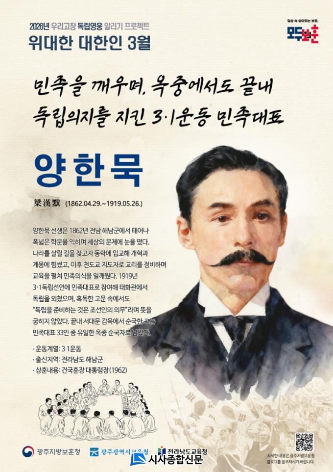 ±¤ÁÖÁö¹æº¸ÈÆÃ»Àº ¡°Á¦107ÁÖ³â 3¡¤1ÀýÀ» ¸ÂÀÌÇÏ¿© ¾çÇѹ¬ ¼±»ýÀÇ »î°ú µ¶¸³Á¤½ÅÀ» ³Î¸® ¾Ë¸®°í Áö¿ª¹ÎµéÀÌ ¿ì¸® °íÀåÀÇ ÀÚ¶û½º·¯¿î ¿ª»ç¸¦ µÇ»õ±â´Â °è±â°¡ µÇ±â¸¦ ¹Ù¶õ´Ù¡±°í ¹àÇû´Ù.