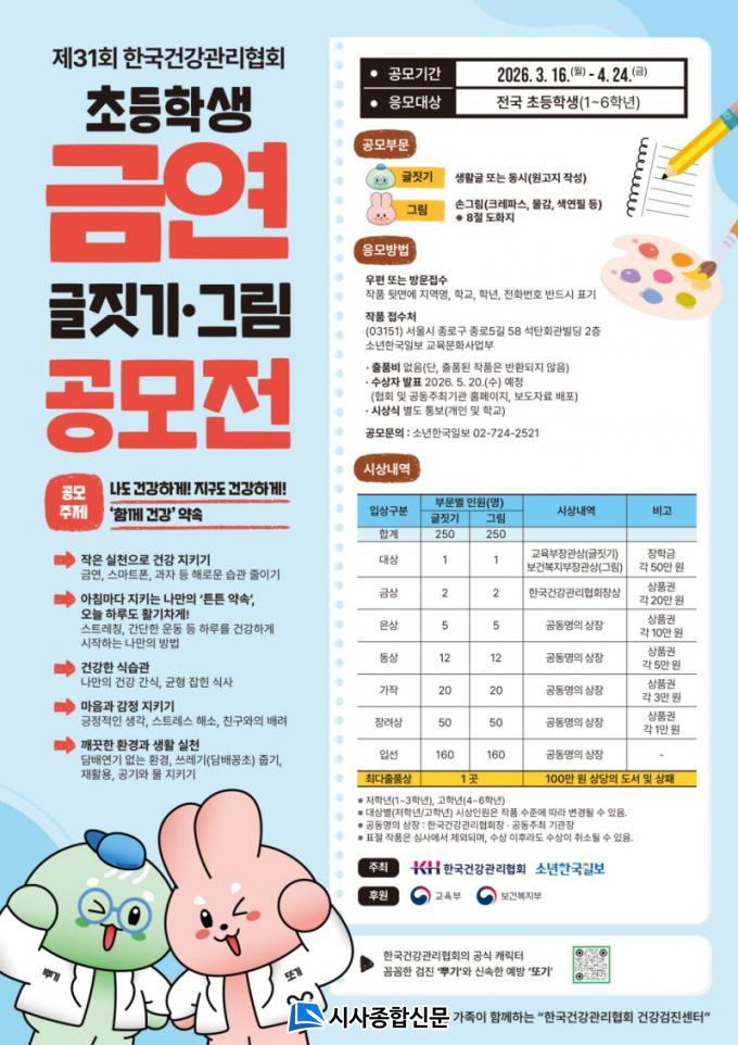 ¿ÃÇØ °ø¸ð ÁÖÁ¦´Â¡®³ªµµ °Ç°ÇϰÔ! Áö±¸µµ °Ç°ÇϰÔ! ÇÔ²² °Ç° ¾à¼Ó¡¯À¸·Î, Âü°¡ ÇлýµéÀº ±Ý¿¬ ½ÇõÀ» ºñ·ÔÇØ ¿Ã¹Ù¸¥ ½Ä½À°ü, ±ÔÄ¢ÀûÀÎ ¿îµ¿, ±àÁ¤ÀûÀÎ ¸¶À½°¡Áü, ±ú²ýÇÑ È¯°æÀ» ÁöŰ´Â »ýȰ½À°ü µîÀ» ±ÛÀ̳ª ±×¸²À¸·Î ÀÚÀ¯·Ó°Ô Ç¥ÇöÇÏ¸é µÈ´Ù.