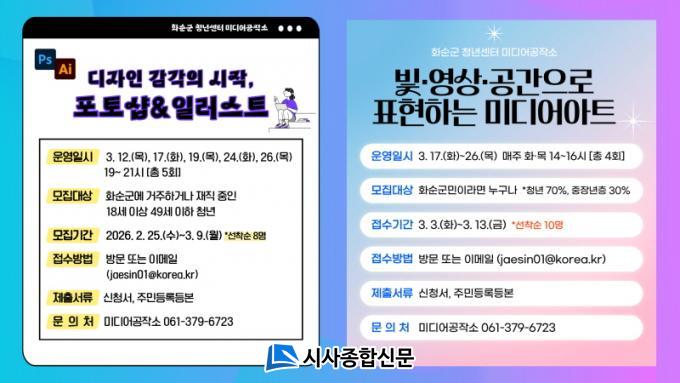 ¹Ìµð¾î¾ÆÆ® °úÁ¤Àº ȼø±º¹Î ´©±¸³ª ½ÅûÇÒ ¼ö ÀÖÀ¸¸ç, û³â 70%, ÁßÀå³â 30%¸¦ ¼±¹ßÇÑ´Ù. Á¢¼ö ±â°£Àº 3¿ù 13ÀϱîÁö´Ù. µÎ °úÁ¤ ¸ðµÎ ½Åû¼¿Í Áֹεî·Ïµîº»À» Á¦ÃâÇØ¾ß Çϸç, ȼø±º û³â¼¾ÅÍ ¹æ¹® ¶Ç´Â °ø½Ä ȨÆäÀÌÁö(https://www.hwasun.go.kr/youth)¸¦ ÅëÇØ ½ÅûÇÒ ¼ö ÀÖ´Ù.