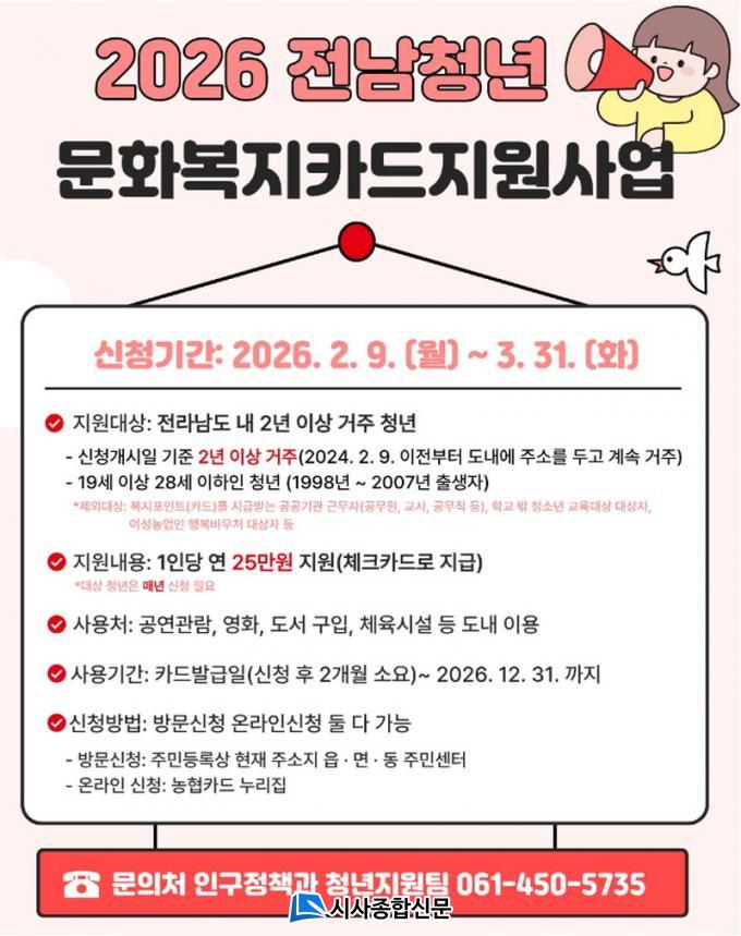 Áö¿ø ´ë»óÀº 2024³â 2¿ù 9ÀÏ ÀÌÀüºÎÅÍ Àü¶ó³²µµ¿¡ ÁÖ¼Ò¸¦ µÎ°í ¹«¾È±º¿¡ 2³â ÀÌ»ó °ÅÁÖÇÑ 19¼¼ºÎÅÍ 28¼¼±îÁö(1998~2007³â Ãâ»ý) û³âÀÌ´Ù. ´ë»óÀÚ·Î ¼±Á¤µÇ¸é 1ÀÎ´ç ¿¬ 25¸¸ ¿øÀÇ ¹®Èº¹Áöºñ¸¦ üũīµå Æ÷ÀÎÆ® ÇüÅ·ΠÁö¿ø¹Þ°Ô µÈ´Ù.