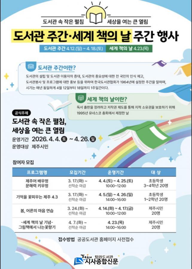 ÇÁ·Î±×·¥ Âü¿©¸¦ ¿øÇÏ´Â ½Ã¹ÎÀº 3¿ù 17ÀϺÎÅÍ Á¦ÁÖÆ¯º°ÀÚÄ¡µµ °ø°øµµ¼°ü ´©¸®Áý(https://jeju.go.kr/lib) Çà»ç/ÇÁ·Î±×·¥¿¡¼ ÇÁ·Î±×·¥º°·Î ½ÅûÇÏ¸é µÈ´Ù.
