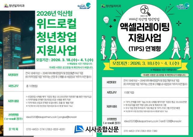 ÀÍ»ê½Ã´Â '2026³â ÀÍ»êÇü À§µå·ÎÄà û³ââ¾÷ Áö¿ø»ç¾÷'°ú '2026³â ÀÍ»êÇü û³ââ¾÷ ¾×¼¿·¯·¹ÀÌÆÃ Áö¿ø»ç¾÷(TIPS ¿¬°èÇü)' Âü¿©ÀÚ¸¦ ¿À´Â 4¿ù 1ÀϱîÁö ¸ðÁýÇÑ´Ù°í 20ÀÏ ¹àÇû´Ù.