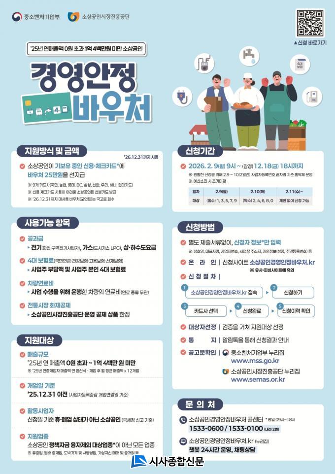 Áö¿ø ´ë»óÀº 2025³â ±âÁØ ¿¬ ¸ÅÃâ¾× 1¾ï 4¹é¸¸¿ø ¹Ì¸¸ÀÇ ¼Ò»ó°øÀÎÀ¸·Î, ½ÅûÀÏ ±âÁØ Á¤»ó ¿µ¾÷ ÁßÀÎ »ç¾÷ÀÚ¶ó¸é ´ëºÎºÐ ½ÅûÀÌ °¡´ÉÇÏ´Ù. ¾÷Á¾ Á¦ÇÑÀÌ ÀϺΠÀÖÀ¸³ª ÀϹÝÀûÀÎ ÀÚ¿µ¾÷ÀÚ´Â Æø³Ð°Ô Áö¿ø ´ë»ó¿¡ Æ÷ÇԵǾî Á¤Ã¥ ü°¨µµ¸¦ ³ô¿´´Ù.