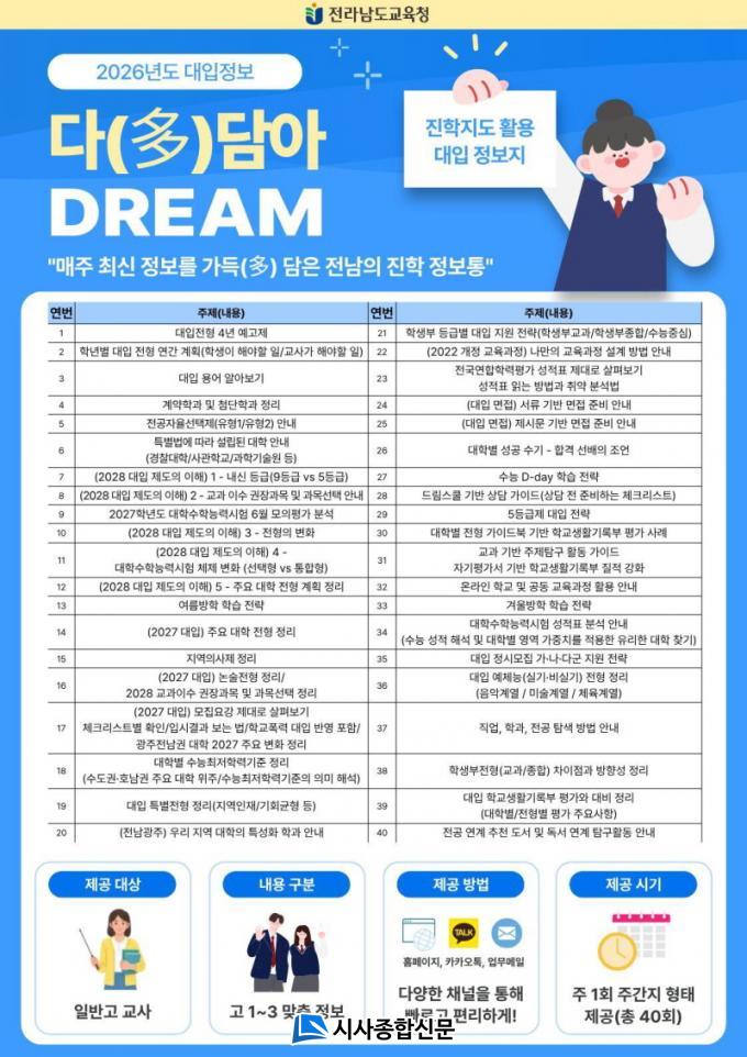 Àü¶ó³²µµ±³À°Ã»Àº ¿¬°£ 40ȸ ÀÌ»óÀÇ Á¤º¸Áö ¹ß°£À» ÅëÇØ Áö¼ÓÀûÀÎ ÁøÇÐÁ¤º¸ Áö¿ø ü°è¸¦ ±¸ÃàÇÒ °èȹÀÌ´Ù. À̸¦ ÅëÇØ ±³»çÀÇ ¾÷¹« ºÎ´ãÀ» °æ°¨Çϰí, Çлý¿¡°Ô º¸´Ù Á¤È®ÇÏ°í ½Å·Úµµ ³ôÀº ÀԽà Á¤º¸¸¦ Á¦°øÇÔÀ¸·Î½á ÁøÇÐ ¼º°ú Çâ»ó¿¡ ±â¿©ÇÒ °ÍÀ¸·Î ±â´ëµÈ´Ù.