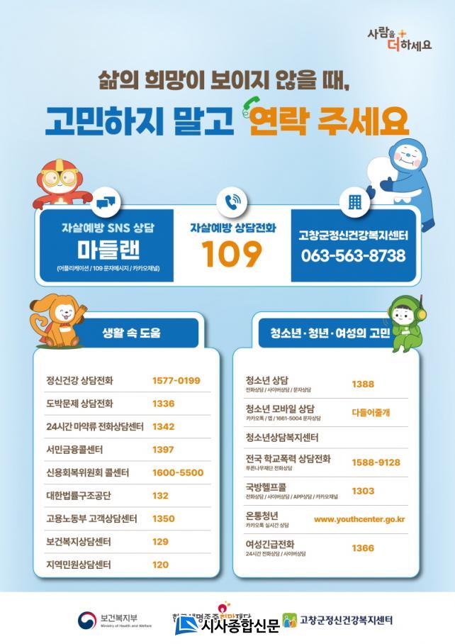°íⱺÁ¤½Å°Ç°º¹Áö¼¾ÅÍ´Â ÀÚ»ì ´Ùºóµµ Áö¿ª ¹× »ý¸í Á¸Áß ¾È½É¸¶À»À» Áß½ÉÀ¸·Î ÀÚ»ì ¿¹¹æ µµ¿ò±â°ü ¾È³» Çö¼ö¸·°ú È«º¸ Æ÷½ºÅ͸¦ °Ô½ÃÇϰí ÀÖ´Ù. À̸¦ ÅëÇØ ±º¹ÎµéÀÌ °ü·Ã Á¤º¸¸¦ º¸´Ù ½±°Ô Á¢ÇÒ ¼ö ÀÖµµ·ÏÇϸç, ÀÚ»ì ¿¹¹æ Ä·ÆäÀΰú È«º¸ Ȱµ¿À» Áö¼ÓÀûÀ¸·Î °ÈÇϰí ÀÖ´Ù.