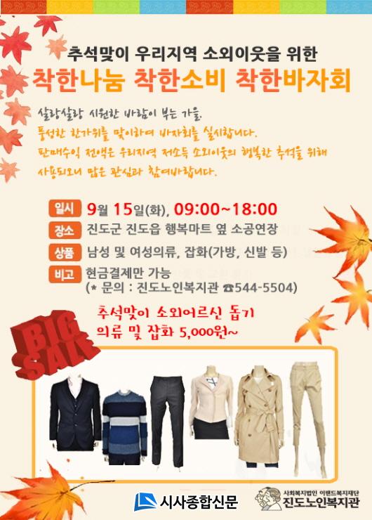 À̹ø ¹ÙÀÚȸ´Â Ãß¼®À» ¸ÂÀÌÇÏ¿© Áö¿ª»çȸ Áֹο¡°Ô°Ô ³ª´®¿¡ µ¿ÂüÇÒ ¼ö ÀÖ´Â ±âȸ¸¦ Á¦°øÇÏ°í ÆÇ¸Å¼öÀÍ Àü¾×À¸·Î Ãß¼®À» ¸ÂÀÌÇÏ¿© Áö¿ª ³» °æÁ¦Àû ¾î·Á¿òÀ» °¡Áø ¼Ò¿ÜÀÌ¿ô¿¡°Ô ¹°Ç°À» Áö¿øÇÏ¿© Áö¿ª ³» ¾Æ¸§´Ù¿î ³ª´®¹®È¸¦ Á¶¼ºÇϱâ À§ÇØ ¸¶·ÃµÇ¾úÀ¸¸ç, ÀÌ·£µå±×·ìÀÇ ÀÇ·ùÈÄ¿øÀ¸·Î ÁøÇàµÇ´Â À̹ø ¹ÙÀÚȸ´Â ³²¼º ¹× ¿©¼ºÀÇ·ù¿Í ±âŸ ÀâÈ(°¡¹æ, ½Å¹ß µî)°¡ Áøµµ±º ÁøµµÀ¾ Çູ¸¶Æ® ¿· ¼Ò°ø¿¬Àå¿¡¼ ¿ÀÀü 9½ÃºÎÅÍ ¿ÀÈÄ 6±îÁö Áö¿ª ÁÖ¹ÎÀ» ´ë»óÀ¸·Î ÁøÇàÇÒ ¿¹Á¤ÀÌ´Ù.