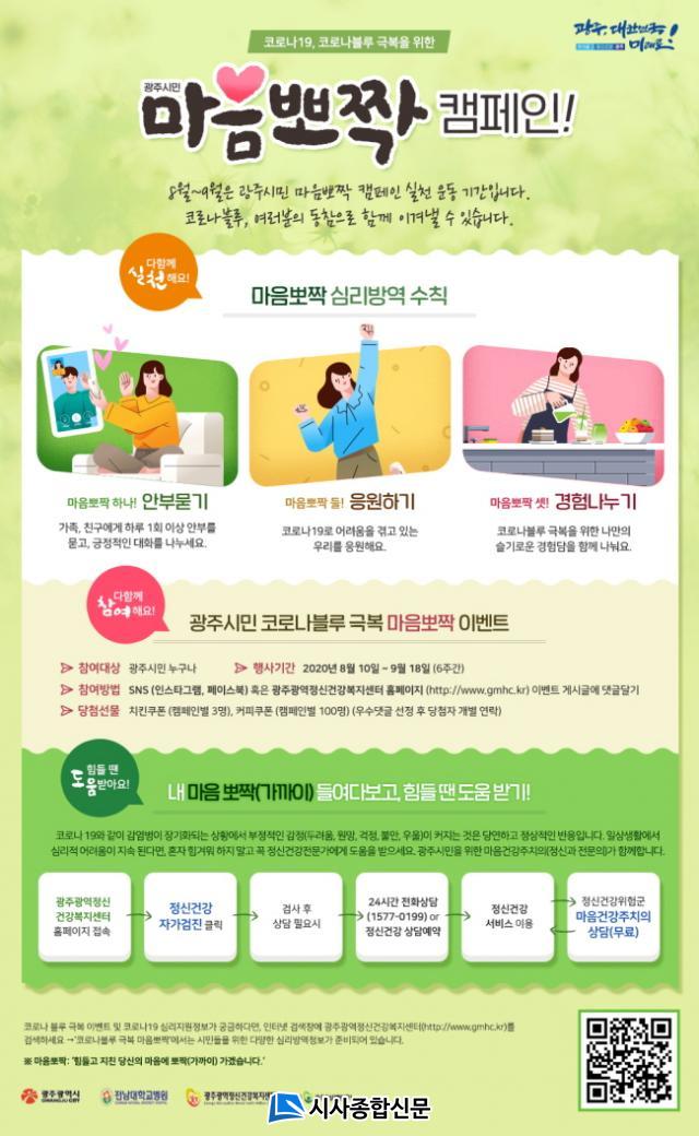 ±¤Áֽô ¡®¸¶À½»Ç¦¡¯ ½Çõ Ä·ÆäÀο¡ ´ëÇÑ ½Ã¹ÎµéÀÇ Àû±ØÀûÀÎ Âü¿©¸¦ À¯µµÇϱâ À§ÇØ ¿À´Â 9¿ù18ÀϱîÁö ¿Â¶óÀÎ À̺¥Æ®µµ ½Ç½ÃÇÑ´Ù. À̺¥Æ® Âü¿©´Â ±¤ÁÖ±¤¿ªÁ¤½Å°Ç°º¹Áö¼¾ÅÍ È¨ÆäÀÌÁö³ª ¼Ò¼È³×Æ®¿öÅ©½Ã½ºÅÛ(SNS¡¤ÀνºÅ¸±×·¥, ÆäÀ̽ººÏ)¿¡ ¡®¸¶À½»Ç¦¡¯ ¼öÄ¢¿¡ ÇØ´çÇÏ´Â ³»¿ëÀ» ´ñ±Û´Þ±âÇÏ¸é µÇ¸ç, Ãß÷À» ÅëÇØ ÃÑ 303¸í¿¡°Ô ¼ÒÁ¤ÀÇ ¸ð¹ÙÀÏ ÄíÆùÀ» Áö±ÞÇÑ´Ù.
