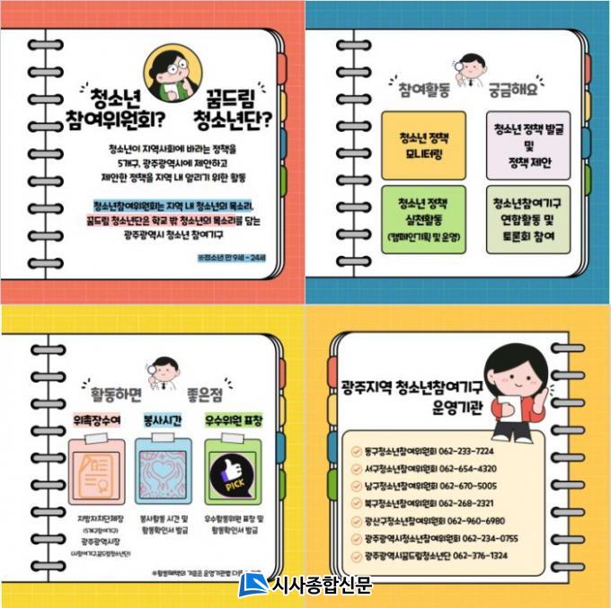 ±¤ÁÖ±¤¿ª½Ã û¼Ò³â Âü¿©±â±¸(µ¿¡¤¼¡¤³²¡¤ºÏ¡¤±¤»ê±¸ û¼Ò³âÂü¿©À§¿øÈ¸, ±¤ÁÖ±¤¿ª½Ãû¼Ò³âÂü¿©À§¿øÈ¸, ±¤ÁÖ±¤¿ª½Ã²Þµå¸²Ã»¼Ò³â´Ü)´Â û¼Ò³âÀÌ Á÷Á¢ Á¤Ã¥À» ¸ð´ÏÅ͸µ ¹× û¼Ò³âµé¿¡°Ô ÇÊ¿äÇÑ Á¤Ã¥Á¦¾È Ȱµ¿À» ¿î¿µÇϸç, Áö¿ª ³» û¼Ò³âÂü¿©±â±¸¿Í ¿¬ÇÕȰµ¿À» ÅëÇØ Á¤Ã¥À» °øÀ¯Çϰí Åä·Ðȸ ¹× Á¤Ã¥Á¦¾È Ä·ÆäÀΠȰµ¿À» ÁøÇàÇÑ´Ù.