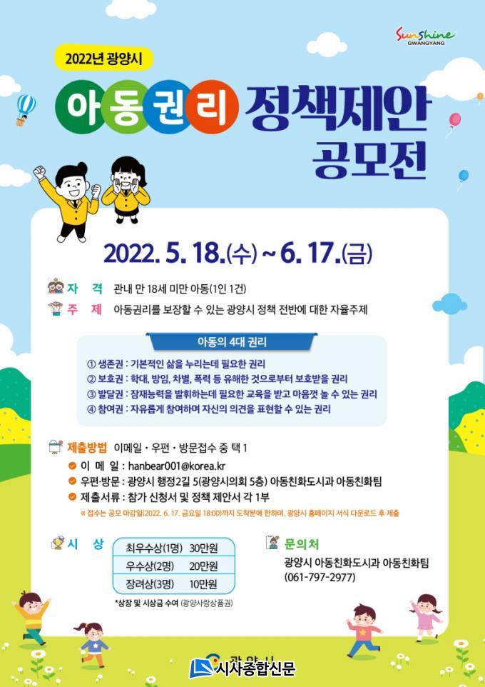 °ø¸ð ÁÖÁ¦´Â ¾Æµ¿±Ç¸®(¡â»ýÁ¸±Ç ¡âº¸È£±Ç ¡â¹ß´Þ±Ç ¡âÂü¿©±Ç)¸¦ º¸ÀåÇÒ ¼ö ÀÖ´Â ±¤¾ç½Ã Á¤Ã¥ Àü¹Ý¿¡ ´ëÇÑ ÀÚÀ²ÁÖÁ¦·Î ÁøÇàµÇ¸ç, ±¤¾ç½Ã °ÅÁÖ ¸¸ 18¼¼ ¹Ì¸¸ÀÎ ¾Æµ¿ÀÌ¸é ´©±¸³ª Âü¿©ÇÒ ¼ö ÀÖ´Ù. Âü¿©¹æ¹ýÀº °ø¸ð±â°£¿¡ À̸ÞÀÏ, ¿ìÆí¡¤¹æ¹® Á¢¼ö Áß ¼±ÅÃÇØ ±¤¾ç½Ã ȨÆäÀÌÁö¿¡¼ Âü°¡ ½Åû¼, Á¤Ã¥ Á¦¾È¼¸¦ ´Ù¿î¹Þ¾Æ Á¦ÃâÇÏ¸é µÈ´Ù.