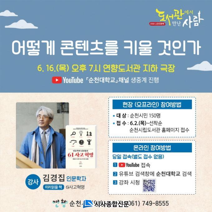 ÇÑÆí ½Ã¹ÎÀι®ÇÐ ¡®µµ¼°ü¿¡¼ ¸¸³ »ç¶÷¡¯Àº ´Ù¾çÇÑ ÁÖÁ¦·Î °¢ ºÐ¾ßÀÇ Àú¸íÇÑ ¸í»ç¸¦ ÃÊûÇÏ¿© ÁøÇàÇÏ´Â Àι®ÇÐ °Á ÇÁ·Î±×·¥À¸·Î º¸´Ù ÀÚ¼¼ÇÑ »çÇ×Àº ¼øÃµ½Ã¸³µµ¼°ü ´©¸®Áý(https://library.suncheon.go.kr)À» Âü°íÇϰųª ¿¬Çâµµ¼°ü(¢Ï061-749-8555)À¸·Î ¹®ÀÇÇÏ¸é µÈ´Ù.