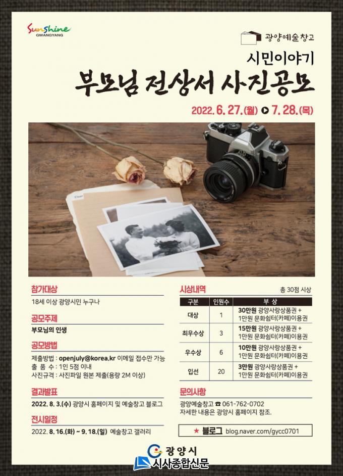 ±¤¾ç½Ã´Â û¼Ò³â»Ó¸¸ ¾Æ´Ï¶ó 18¼¼ ÀÌ»ó ÀϹݽùÎÀ» ´ë»óÀ¸·Î »çÁø °ø¸ðµµ ÃßÁøÇÑ´Ù. ¡®ºÎ¸ð´Ô Àü »ó¼¡¯ »çÁø °ø¸ð´Â ¡®ºÎ¸ð´ÔÀÇ Àλý¡¯À» ÁÖÁ¦·Î ¿ì¸® ºÎ¸ð´ÔÀÇ »ì¾Æ¿Â À̾߱Ⱑ ´ã±ä Ãß¾ïÀÇ »çÁøÀ» 1Àδç ÃÖ´ë 5Àå±îÁö Á¦ÃâÇÒ ¼ö ÀÖÀ¸¸ç, »çÁø À̹ÌÁö ÆÄÀÏ(¿øº») ¿ë·®ÀÌ 2MB ÀÌ»óÀ̾î¾ß ÇÑ´Ù.