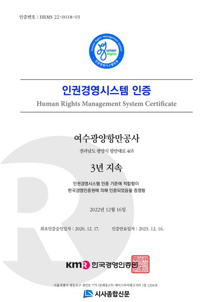| ¿©¼ö±¤¾çÇ׸¸°ø»ç, Àαǰ濵½Ã½ºÅÛÀ¸·Î ESG °æ¿µ ½ÇÇö Àαǰ濵½Ã½ºÅÛ 3³â ¿¬¼Ó ÀÎÁõ °»½Å¡¦ Àαǰ濵 °¡Ä¡ ½ÇÇö |
